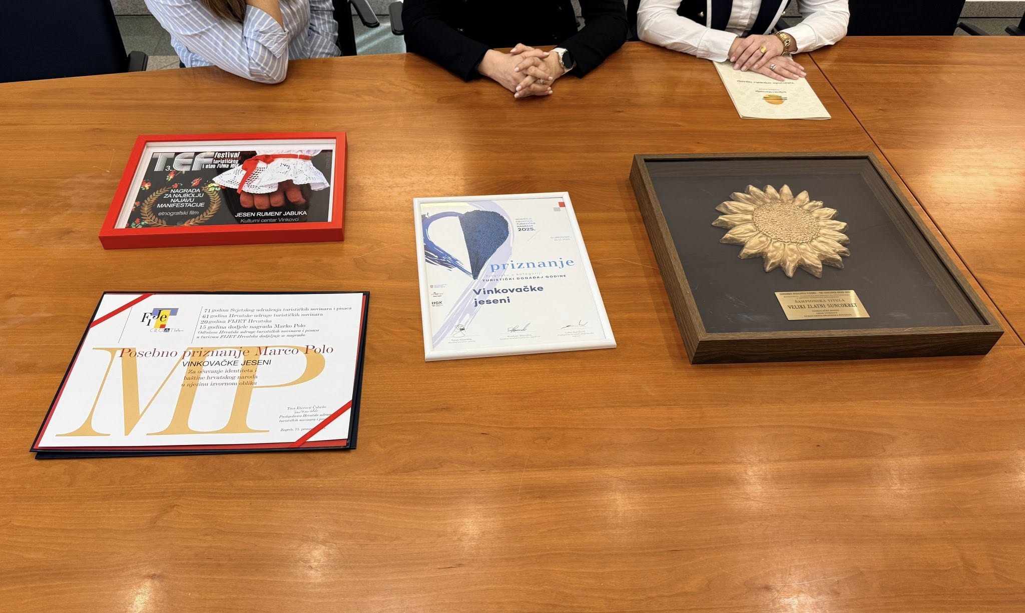 „Moramo se prisjetiti i svih priznanja koja smo tijekom prošle godine dobili od struke, povodom 60 godina trajanja ove kulturno-turističke manifestacije. Među njima se ističe šampionska titula Zlatni veliki suncokret, dodijeljena za najbolji turistički događaj na otvorenom. Uvršteni smo i među tri najbolja događanja u kategoriji Turistički događaj godine na Danima hrvatskog turizma. Također smo dobitnici posebnog priznanja Marco Polo za očuvanje identiteta i baštine hrvatskog naroda u njezinu izvornom obliku, kao i prve nagrade za najbolju najavu manifestacije u kategoriji etnografski film za tematski naslovljen uradak „Jesen rumeni’ jabuka”. Nastavljajući se na ovogodišnju temu Vinkovačkih jeseni, svi će putovi voditi u Vinkovce, središte hrvatske tradicijske kulture, gdje ćemo se okupiti oko vrijednosti koje smo naslijedili od naših prethodnika”, kazala je predsjednica ZAKUD-a Vukovarsko-srijemske županije Martina Kelava.